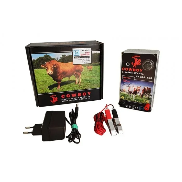 Cowboy 1100 eco lite — це потужний генератор імпульсів, який може працювати від мережі 230 В або ж від акумулятора 12 вольтів, сила удару в електропастуха 1,1 Джоуля, прилад можна використовувати для великих ситих огорож до 20 км. Cowboy 1100 eco lite має міцний, ударостійкий і атмосферостійкий корпус, ступінь захисту корпусу IP 65. Пристрій має оптичну перевірку працездатності за допомогою світлового індикатора зверху.
