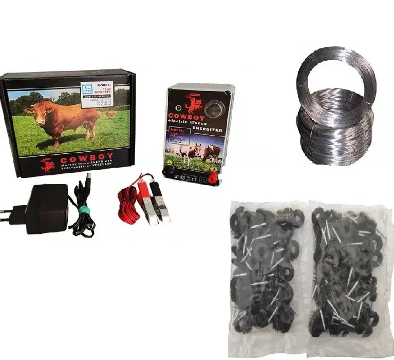 Готовий комплект електоропастуха на 1 Г з потужністю 1.1 Дж, у комплекті все необхідне — електропастух cowboy 1100 eco lite, Дріт оцинкований і ізолятори, які можна монтувати на цвях або саморіз.