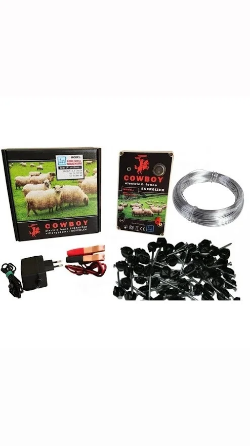 Готовий комплект електоропастуха на 5 га з потужністю 8.5 Дж, у комплекті все необхідне — електропастух cowboy 8500 magnum, Дріт оцинкований і ізолятори, які можна монтувати на цвях або саморіз.