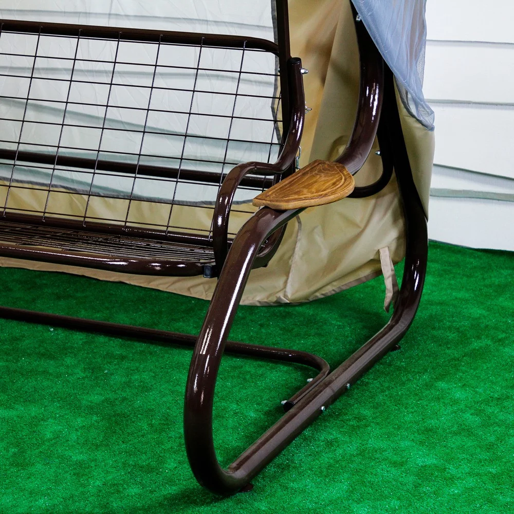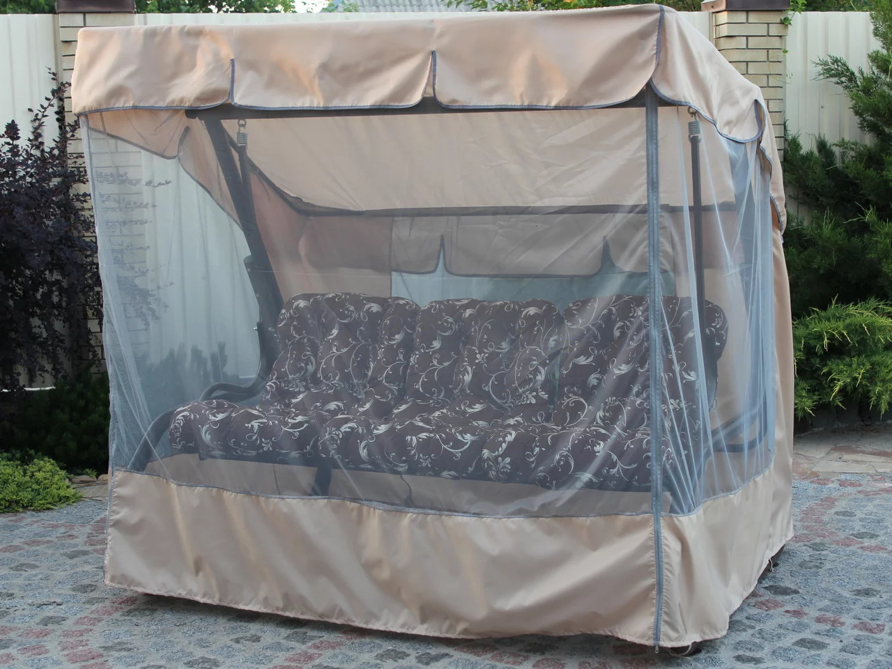 Ця модель гойдалки добре підійде для класичних екстер'єрів заміських будинків і котеджів. Гармонійне поєднання бежевого тенту та представлених варіантів забарвлення подушок із шоколадним каркасом роблять ці гойдалки універсальними й водночас дуже цікавими зовні. Міцна конструкція витримує навантаження до 400 кг. Гойдалка можна використовувати за прямим призначенням, а можна розкласти спинку та закріпити конструкцію від розгойдування, отримавши зручне літнє ліжко. Комахи точно не потривожать ваш сон, адже до комплекту входить москітна сітка на всю площу каркаса. Для вашої зручності ми пропонуємо три окремі м'які подушки (наповнювач синтепон), на сидіння і спинку, які пошиті між собою. На вибір доступні кілька варіантів забарвлення. У будь-якому разі, ви отримуєте якісні знімні чохли, які можна прати в машинці. За бажання ми можемо встановити невеликі, дубові полички на каркасі.