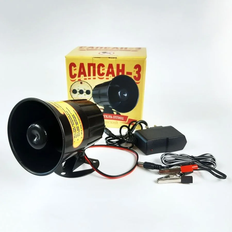 Звуковий відлякувач птахів «САПСАН 3» є сучасною вітчизняною розробкою і призначений для відлякування ворон, граків, шпаків, дроздів, галок, сорок, чайок. Залежно від того, які птахи представляють проблему на вашому об'єкті, ми пропонуємо п'ять наборів звуків: