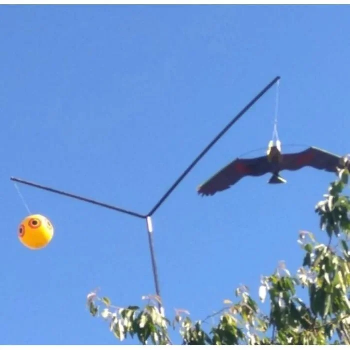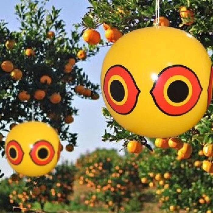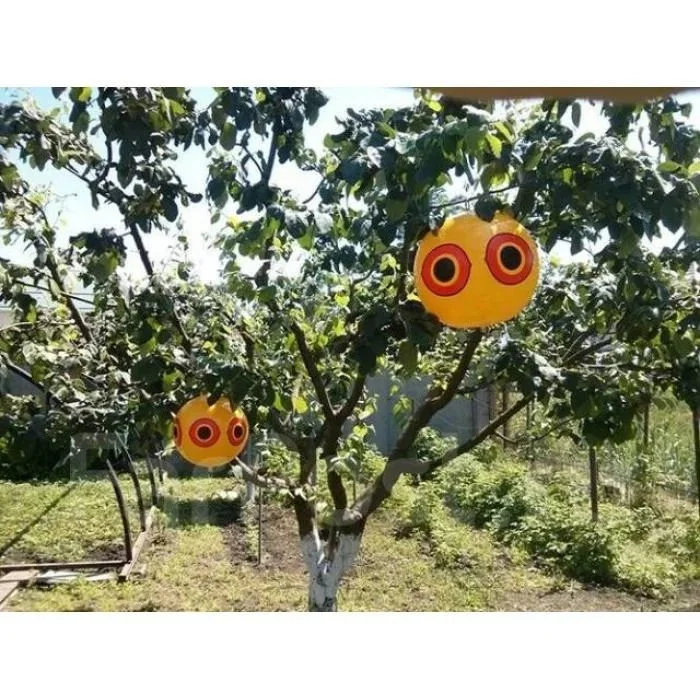 Вінілова 3D куля з очима хижака “Сова” – безшумний, ефективний та естетичний засіб відлякування птахів. Великі очі хижої птиці нанесені на вінілову кулю діаметром 40 сантиметрів і викликають у інших птахів інстинктивний страх. Голографічне нанесення зображення надає об’єм та реалістичність, а похитування кулі на вітрі доповнює ефект.