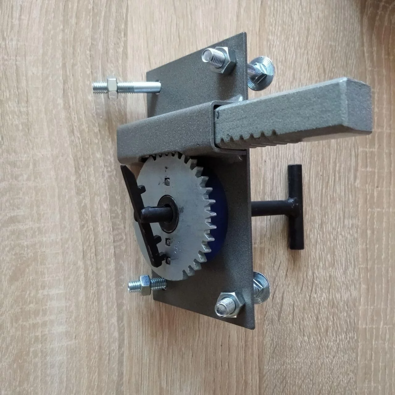 Виліт засуву замка відбувається за один повний оборот і становить 70 мм, для гаражних замків величина вильоту засуву дуже важлива. Рух засуву наводиться шестернею. На шестірні є зубці, на засові замка зачепи, при взаємодії відбувається відмикання або замикання замка. У закритому положенні рух засуву заблоковано.