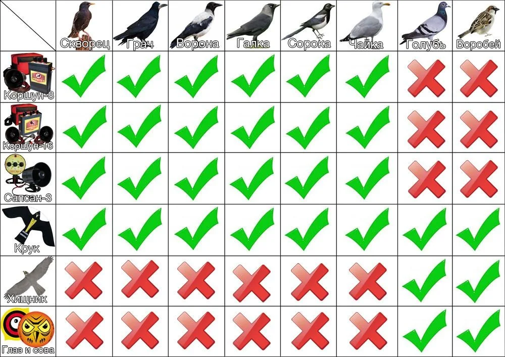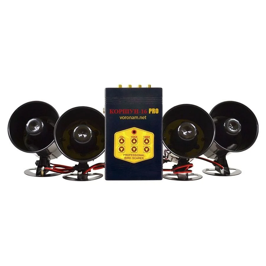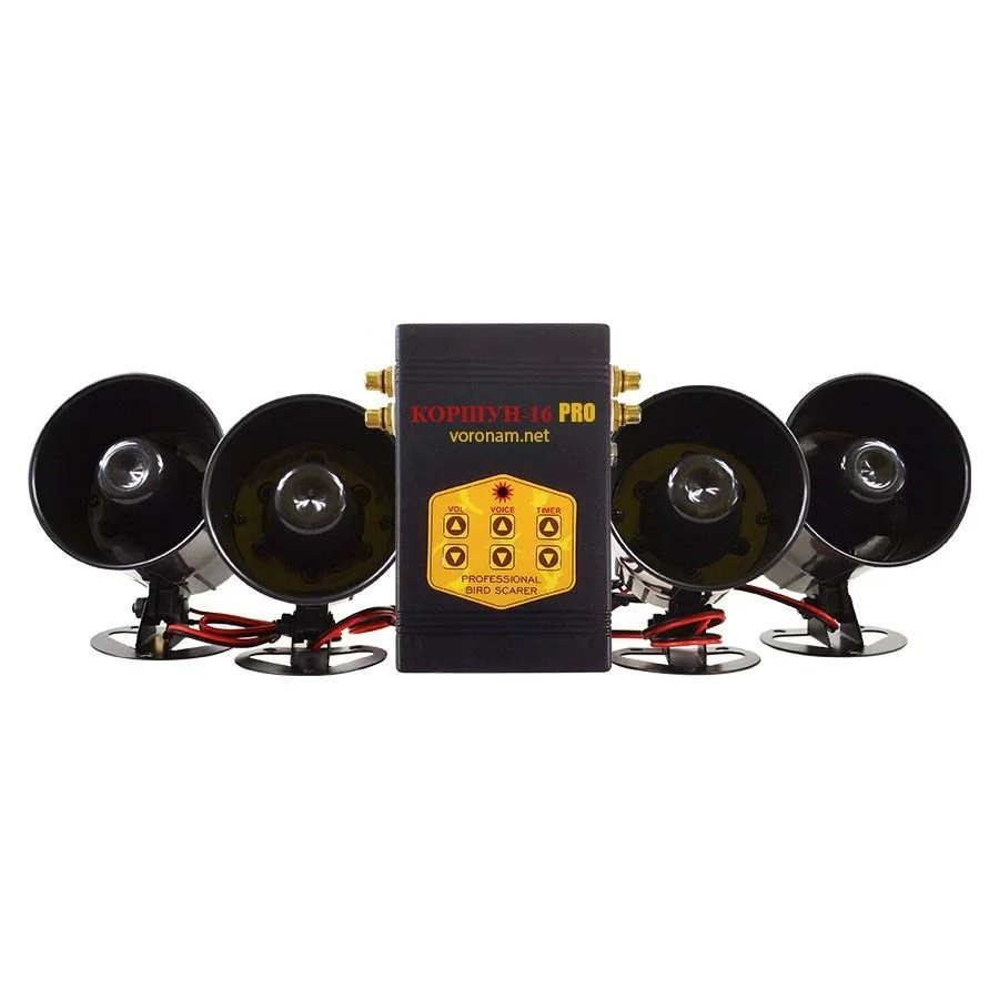 Звуковий відлякувач птахів «КОРШУН-16 SOLAR» є сучасною вітчизняною розробкою і призначений для відлякування ворон, граків, шпаків, дроздів, галок, сорок, чайок. Залежно від того, які птахи представляють проблему на вашому об'єкті, ми пропонуємо три стандарти або індивідуальний набір звуків: