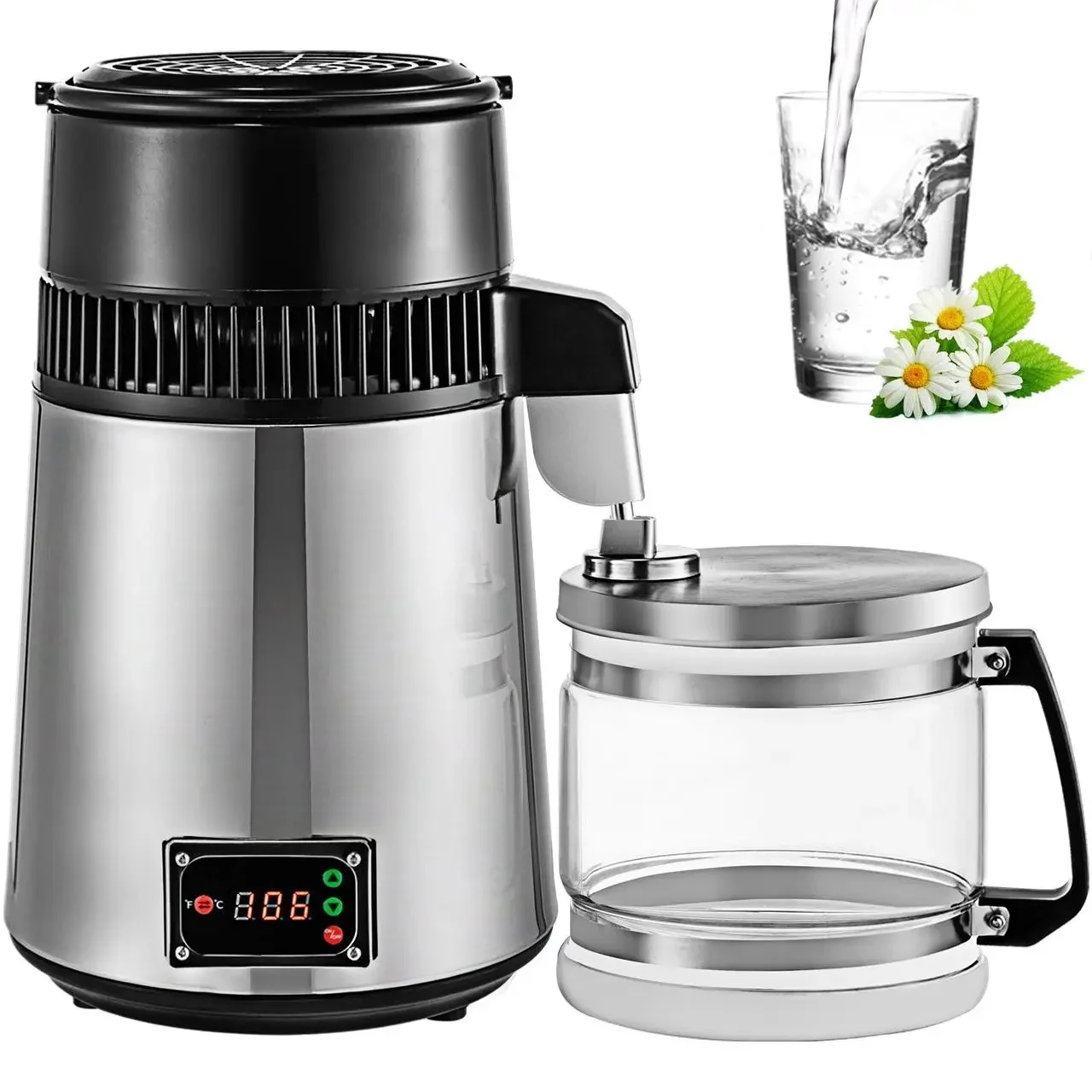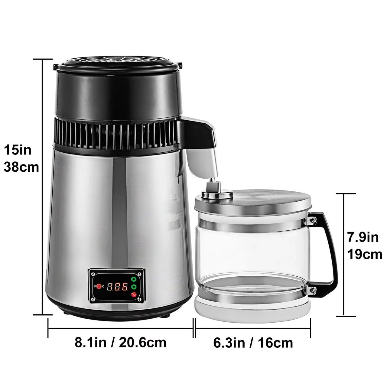 Завдяки алюмінієвій нагрівальній плиті потужністю 750 Вт швидкість дистиляції нашого дистилятора води становить близько 1 л (0,26 галона) на годину, а об'єм дистиляції за 24 години досягає 24 л (6 галонів), з яким вам не потрібно купувати воду у пляшках більше. Боросилікатний графин із силіконовим буфером вміщує 4 л (1,1 галона) дистильованої води.