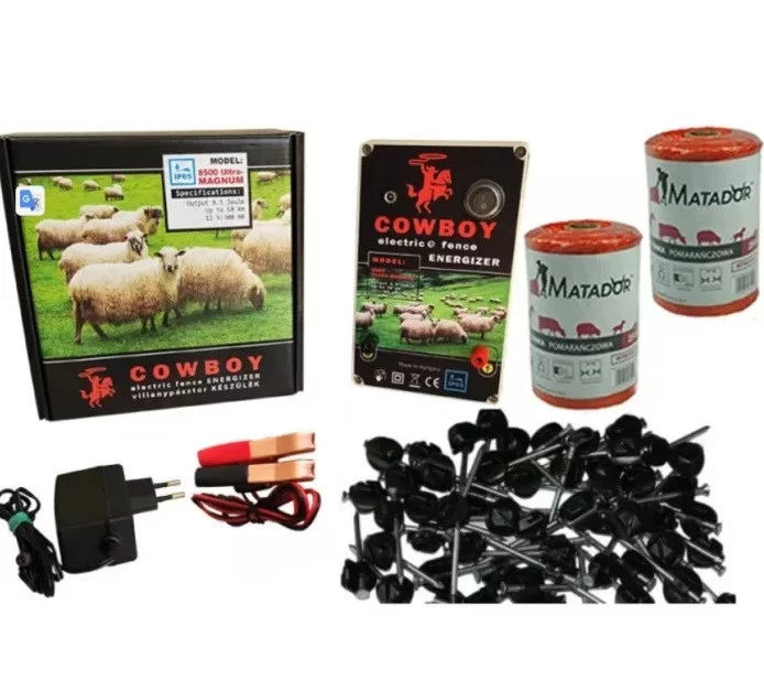 Готовий комплект електоропастуха на 1000 метрів с потужністю 8.5 Дж, в комплекті все необхідне - електропастух cowboy 8500 magnug, шнур та ізолятори які можна монутвати на цвях або саморіз.