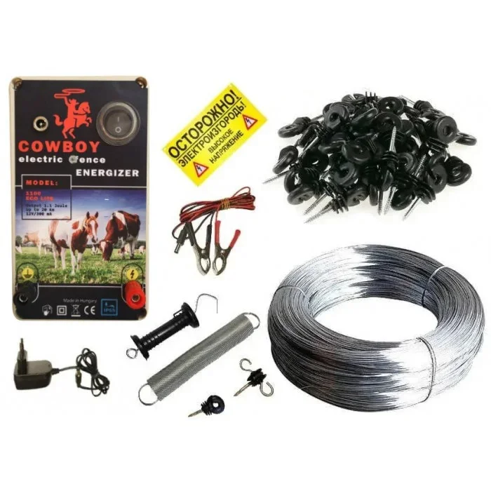 Готовий комплект електоропастуха з потужністю 1.1 Дж, у комплекті все необхідне — електропастух cowboy 1100 eco lite, якісний шнур і ізолятори, які можна монтувати на цвях або саморіз.