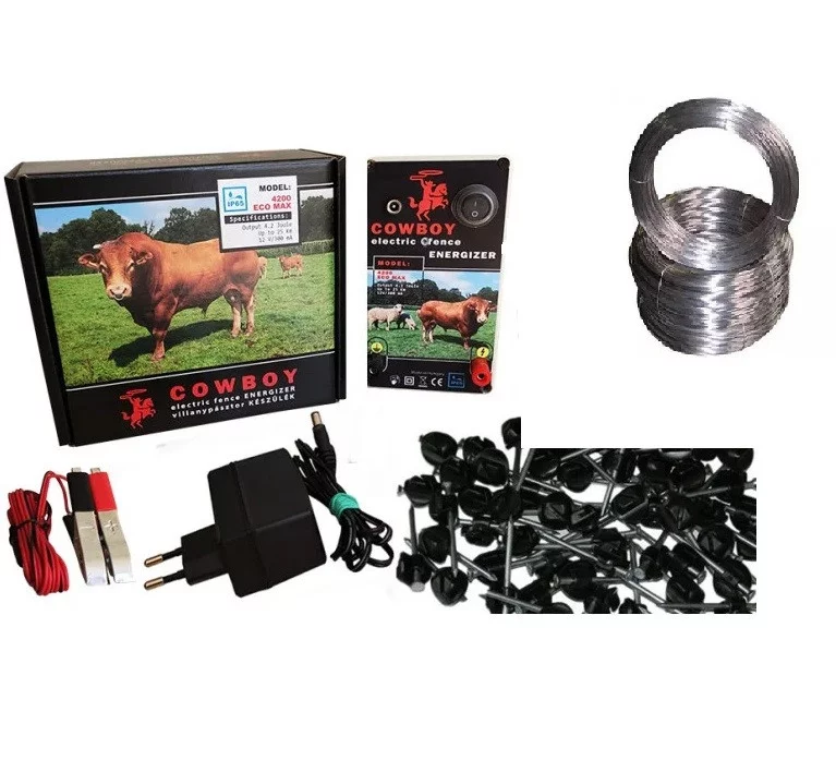 Готовий комплект електоропастуха з потужністю 4.2 Дж, у комплекті все необхідне — електропастух cowboy 4200 eco max, Дріт оцинкований і ізолятори, які можна монтувати на цвях або саморіз.