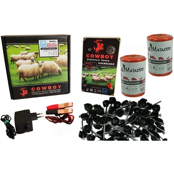 Готовий комплект електоропастуха с потужністю 8.5 Дж, в комплекті все необхідне - електропастух cowboy 8500 magnug, якісний шнур та ізолятори які можна монутвати на цвях або саморіз.