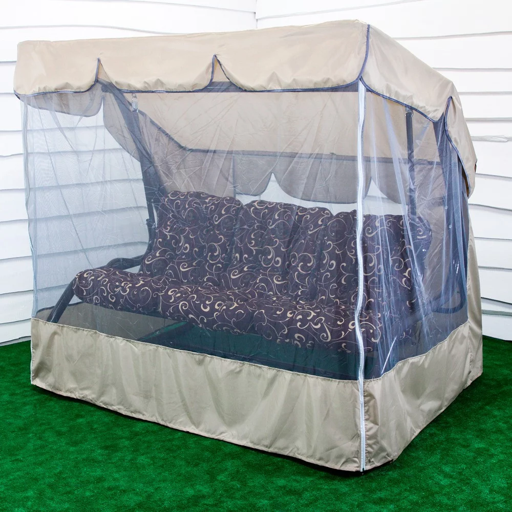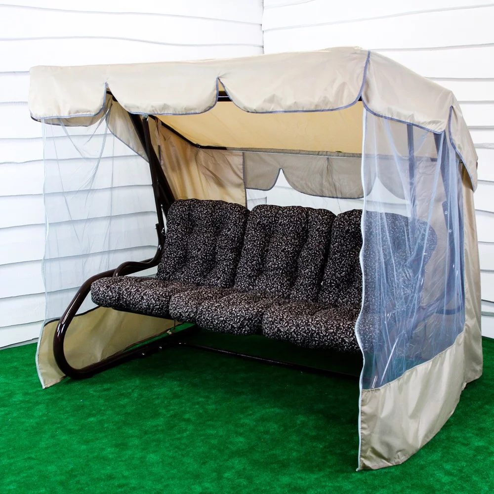 Ця модель гойдалки добре підійде для класичних екстер'єрів заміських будинків і котеджів. Гармонійне поєднання бежевого тенту та представлених варіантів забарвлення подушок із шоколадним каркасом роблять ці гойдалки універсальними й водночас дуже цікавими зовні. Міцна конструкція витримує навантаження до 400 кг. Гойдалка можна використовувати за прямим призначенням, а можна розкласти спинку та закріпити конструкцію від розгойдування, отримавши зручне літнє ліжко. Комахи точно не потривожать ваш сон, адже до комплекту входить москітна сітка на всю площу каркаса. Для вашої зручності ми пропонуємо три окремі м'які подушки (наповнювач синтепон), на сидіння і спинку, які пошиті між собою. На вибір доступні кілька варіантів забарвлення. У будь-якому разі, ви отримуєте якісні знімні чохли, які можна прати в машинці. За бажання ми можемо встановити невеликі, дубові полички на каркасі.