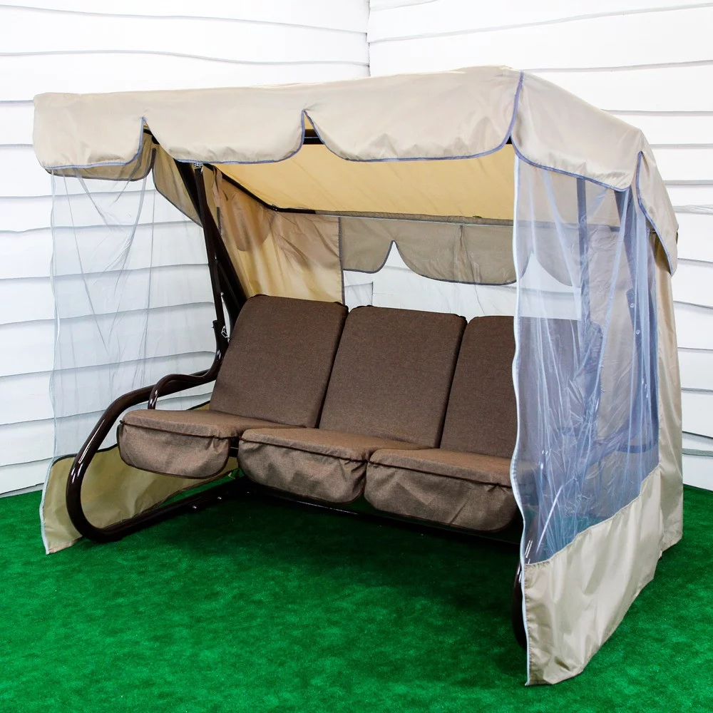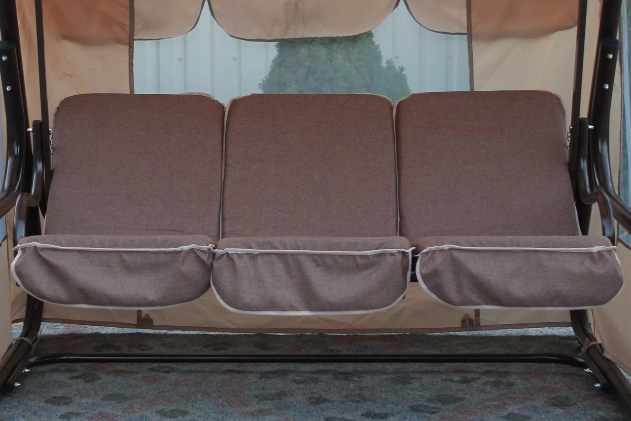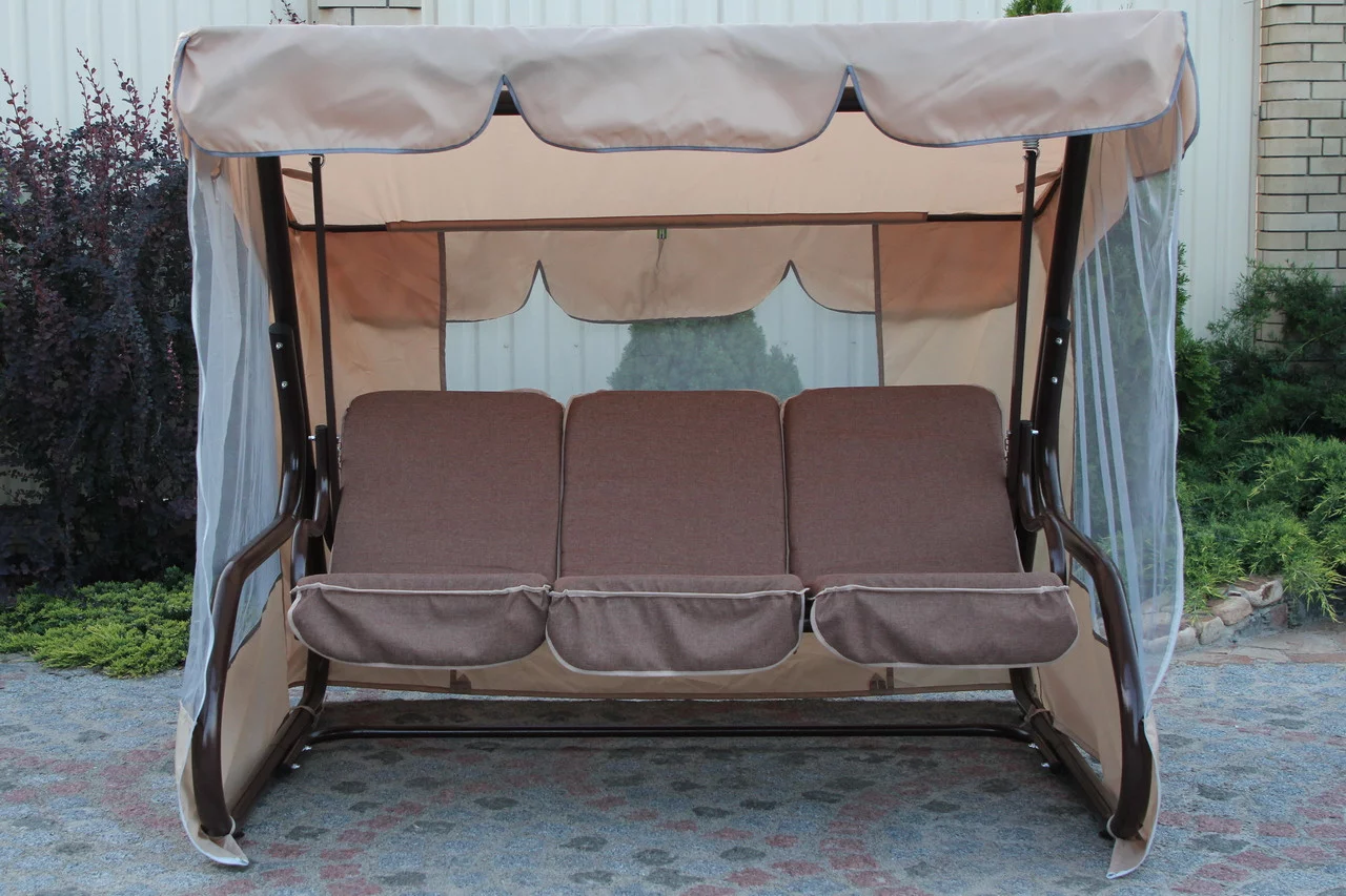 Ця модель гойдалки добре підійде для класичних екстер'єрів заміських будинків і котеджів. Гармонійне поєднання бежевого тенту та представленим варіантом забарвлення подушок із шоколадним каркасом роблять «Брауні» універсальною й одночасно дуже цікавою зовні моделлю. Міцна конструкція витримує навантаження до 400 кг. Гойдалка можна використовувати за прямим призначенням, а можна розкласти спинку та закріпити конструкцію від розгойдування, отримавши зручне літнє ліжко. Комахи точно не потривожать ваш сон, адже до комплекту входить москітна сітка на всю площу каркаса. Для вашої зручності ми пропонуємо три окремі м'які подушки, на сидіння і на спинку. Чохли пошиті з тканини ріжка, цей матеріал зносостійкий і приємний на дотик і легко піддається чищенню. Наповнювач поролон — 80 мм. За бажання ми можемо встановити невеликі, дубові полички на каркасі.