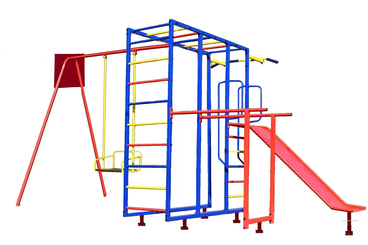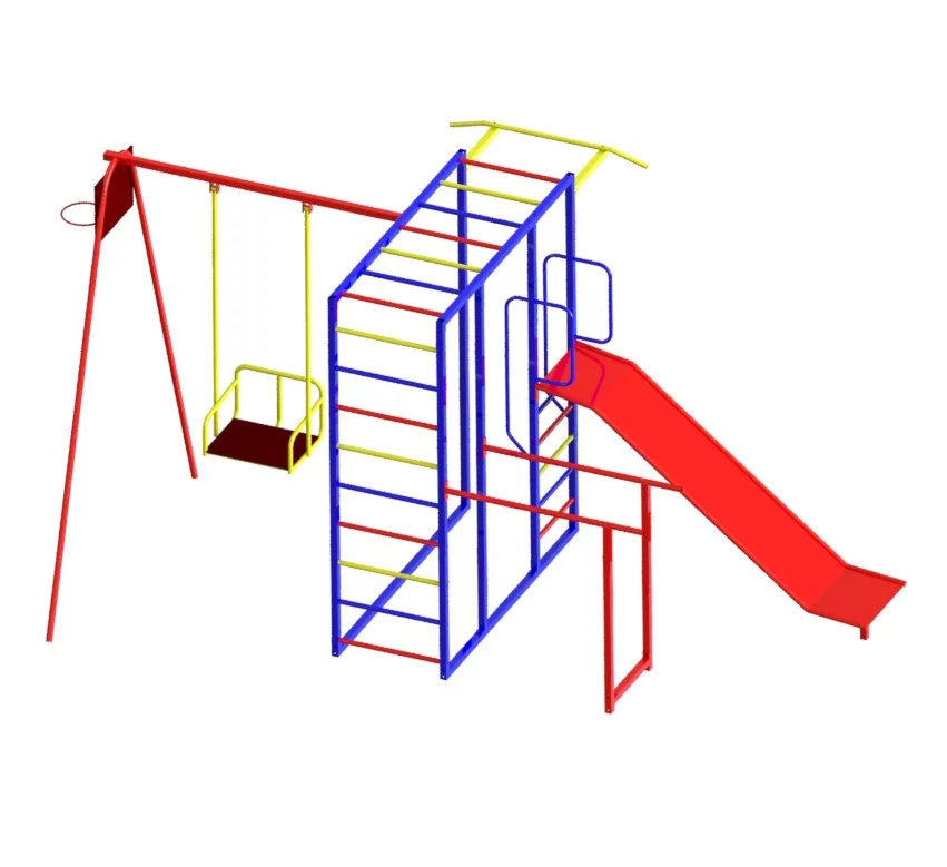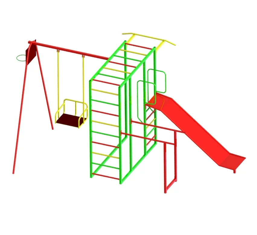 Комплектація: гойдалки, гірка, драбинка на гірку, шведська стінка, рукохід, турнік з широким і вузьким хватом, бруси, баскетбольне кільце, без сітки, комплект кріплень для бетонування.