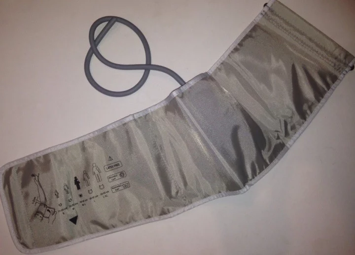 МАНЖЕТА збільшена до приладів для вимірювання артеріального тиску та частоти пульсу автоматичними та напівавтоматичними цифровими тонометрами. Принцип технології манжети полягає в застосуванні внутрішньої м'якої гумової камери, яка створює рівномірний розподіл тиску в руці, що дає змогу знизити неприємні відчуття від стиснення руки. Отже, процес вимірювання артеріального тиску стає комфортнішим і зручнішим для користувача. Має металеве фіксувальне кільце.