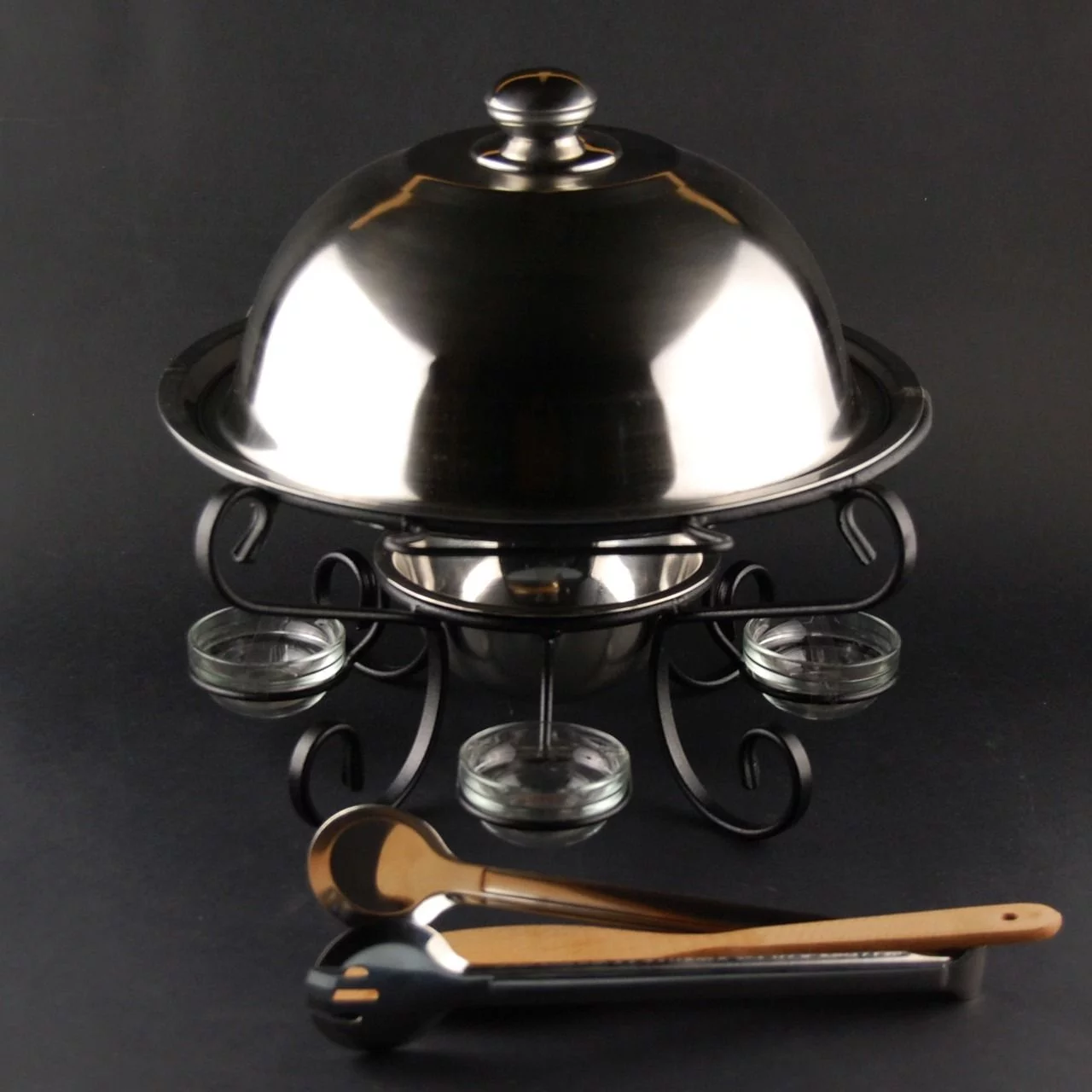 У комплекті 4 скляних соусники, кришка з неіржавкої сталі, щипці для вугілля з неіржавкої сталі, дерев'яна лопатка (черешня)