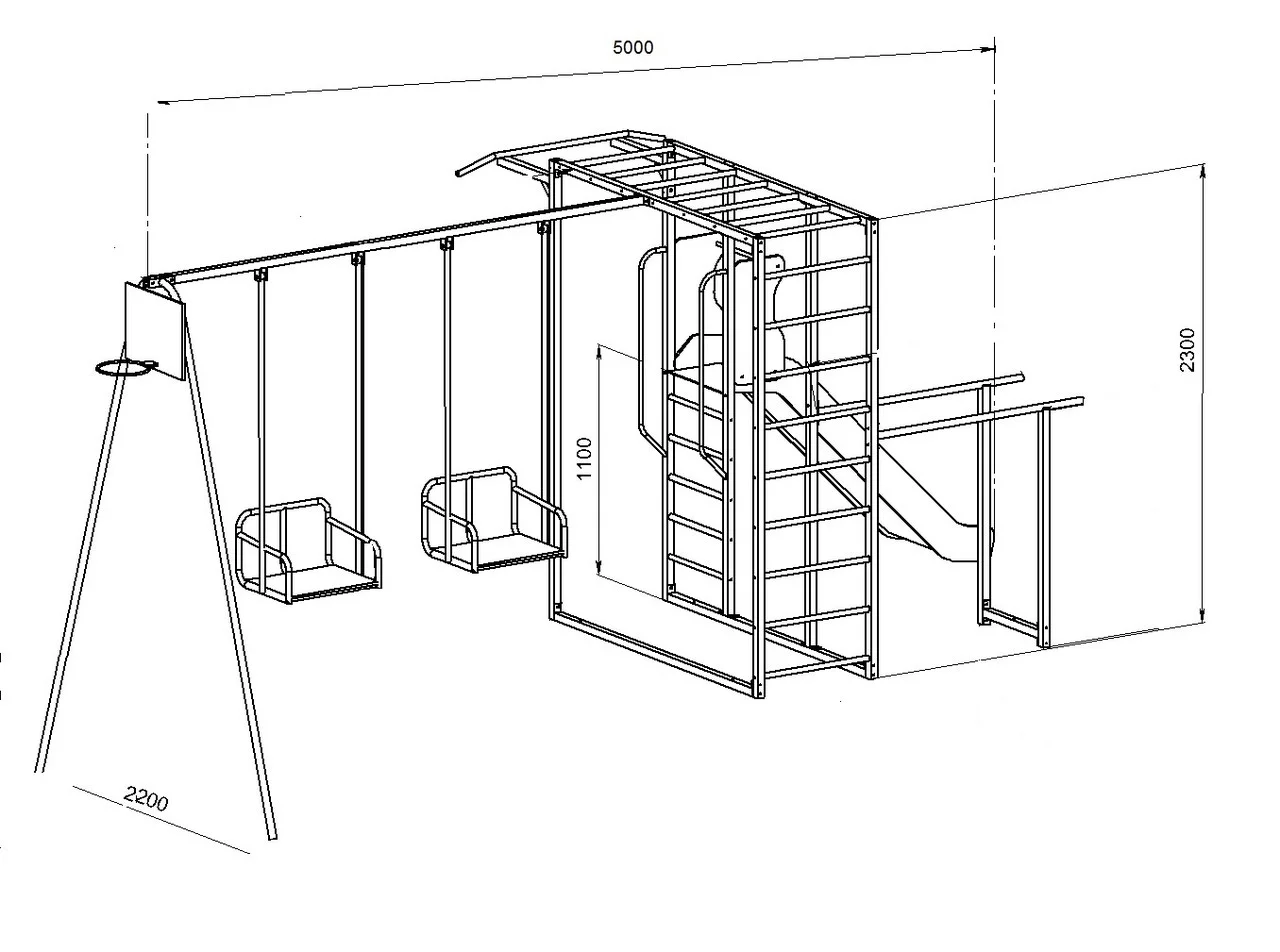 Комплектація: гойдалки, гірка з бортами, драбинка на гірку, шведська стінка, рукохід, турнік з широким і вузьким хватом, бруси, баскетбольне кільце, комплект кріплень для бетонування +навісне обладнання(канат,мотузкові сходи і кільця)
