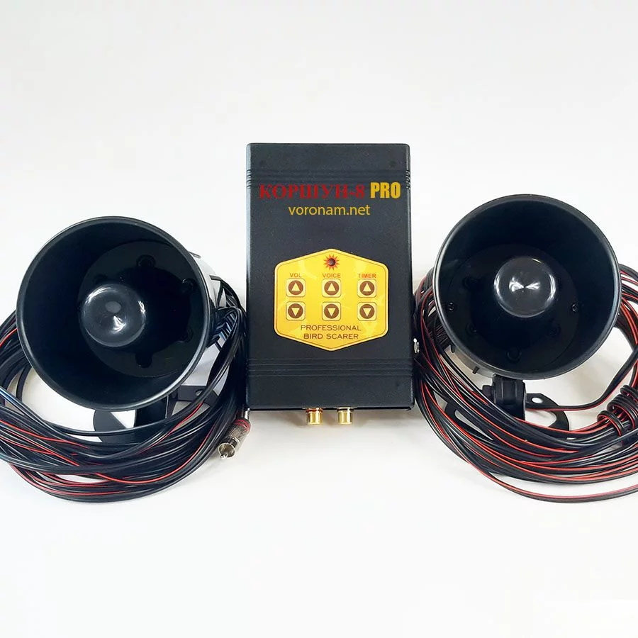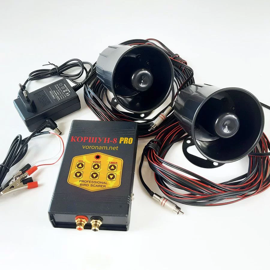 Звуковий відлякувач птахів «КОРШУН-8» є сучасною вітчизняною розробкою і призначений для відлякування ворон, граків, шпаків, дроздів, галок, сорок, чайок. Залежно від того, які птахи представляють проблему на вашому об'єкті, ми пропонуємо п'ять наборів звуків: