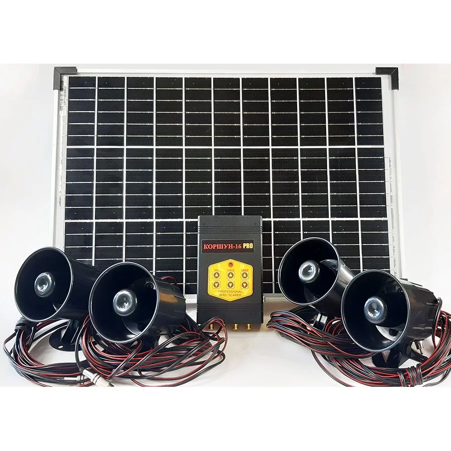 Звуковий відлякувач птахів «КОРШУН-16 SOLAR» є сучасною вітчизняною розробкою і призначений для відлякування ворон, граків, шпаків, дроздів, галок, сорок, чайок. Залежно від того, які птахи представляють проблему на вашому об'єкті, ми пропонуємо три стандарти або індивідуальний набір звуків: